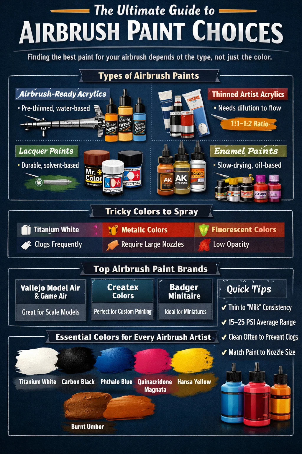 - Ako jesi početnik : Započnite s Vallejo Game Air ili Badger Minitaire — oni su najblaži i najmanje začepljuju.