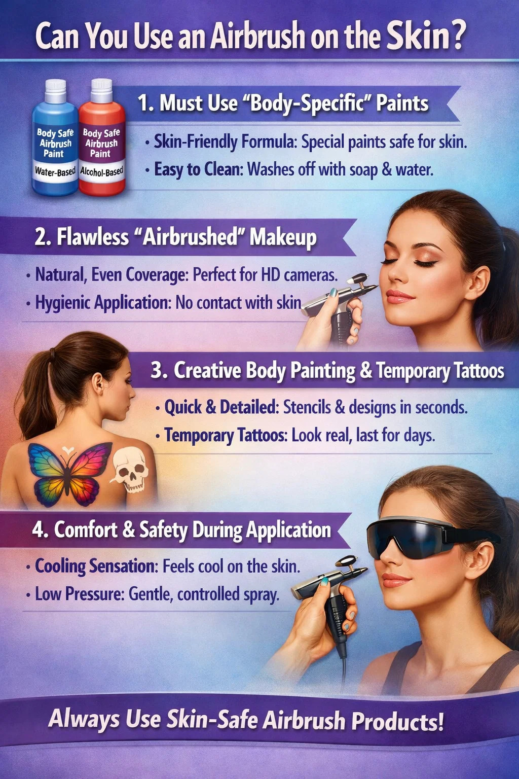 Formula pogodna za kožu: Airbrush boje posebno dizajnirane za kožu obično su na bazi vode ili alkohola, a njihovi sastojci u skladu su sa sigurnosnim kozmetičkim standardima. Izuzetno su lagane teksture i neće začepiti pore niti izazvati alergije kao obične boje.