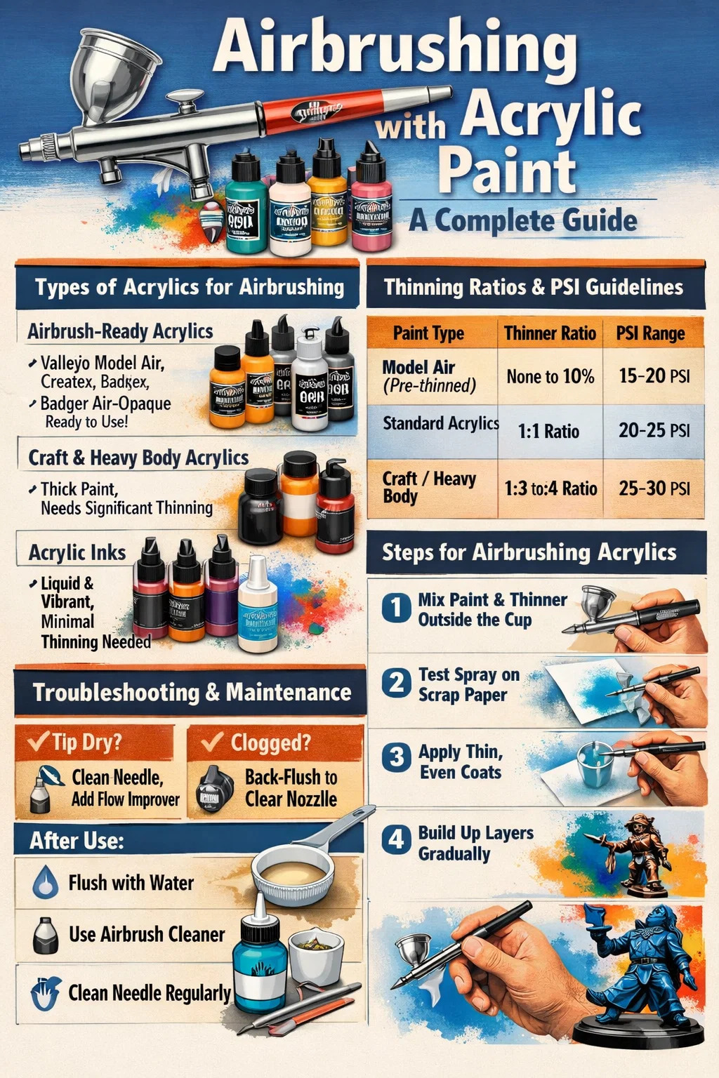 Korištenje destilirana voda je prihvatljiv za osnovno stanjivanje, ali namjenski Airbrush Thinner je superioran. Ovi razrjeđivači sadrže "poboljšivače tečnosti" i "usporivače" koji usporavaju vrijeme sušenja. Ovo je bitno jer se akrili suše isparavanjem; bez usporivača, boja se može osušiti na vrhu igle prije nego što napusti airbrush, fenomen poznat kao "vrh suho".