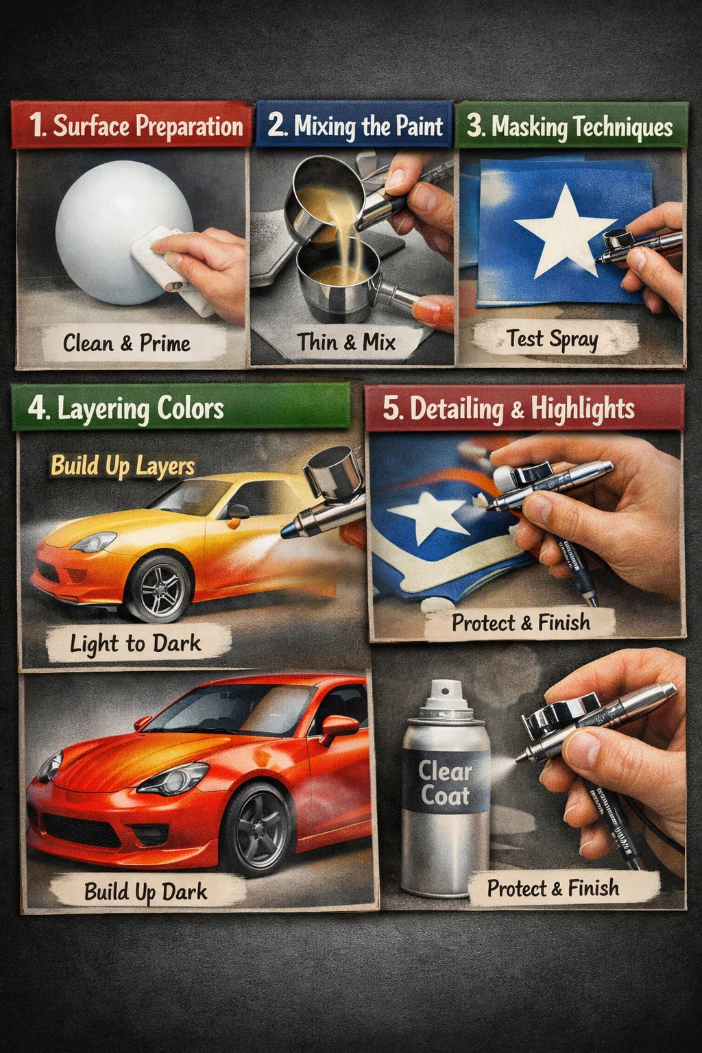 Stvaranje cjelovite slike ili umjetničkog djela korištenjem zračnog kista u biti je proces "izgradnje slojeva od svijetlog do tamnog". Možete to zamisliti kao "prskanje svjetla i sjene" na površinu predmeta.