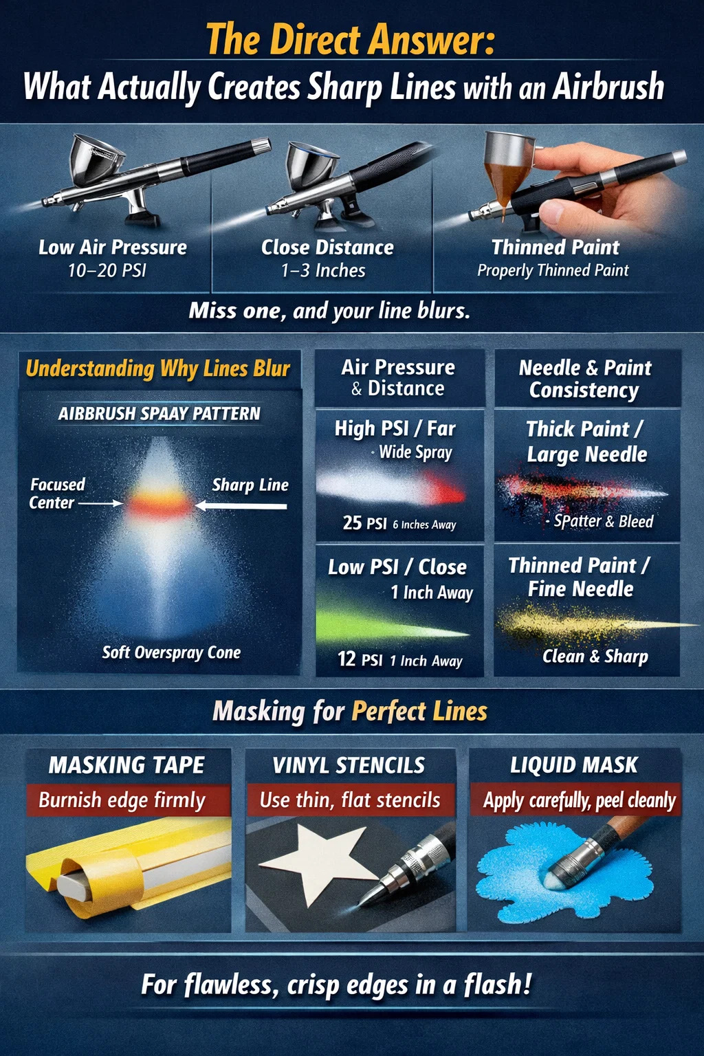 Oštre linije s zračnim kistom svode se na četiri ključne varijable koje rade zajedno: nizak tlak zraka (obično 10-20 PSI) , mala radna udaljenost (1–3 inča od površine), pravilno razrijeđena boja i namjerna kontrola okidača. Ako propustite čak i jedan od ovih, vaša će linija omekšati, prokrvariti ili prskati. Većina početnika ima problema jer rade predaleko od površine i koriste previše pritiska - dvije navike koje odmah ubijaju preciznost.