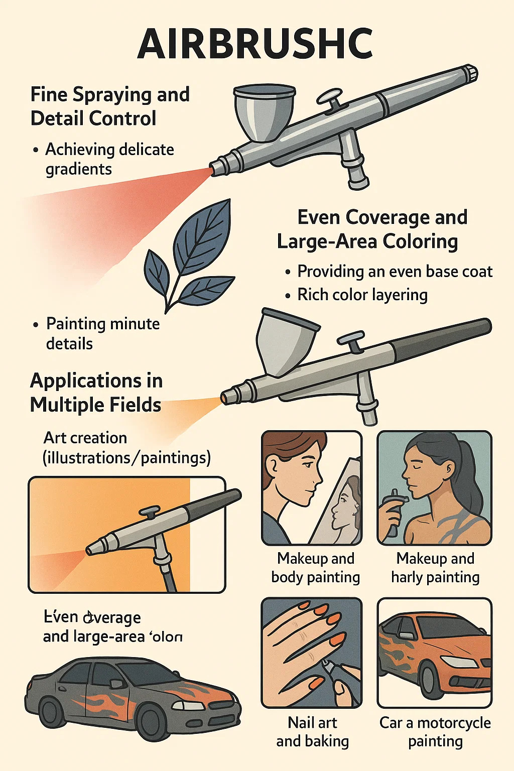 --Pružanje ravnomjernog temeljnog sloja: Airbrushes može pružiti izuzetno ravnomjerno prekrivanje boje na velikim površinama. Ovo je učinkovitije i glađe od tradicionalnih kistova za izradu predmeta koji zahtijevaju besprijekornu površinu (kao što su modeli, automobili i namještaj).